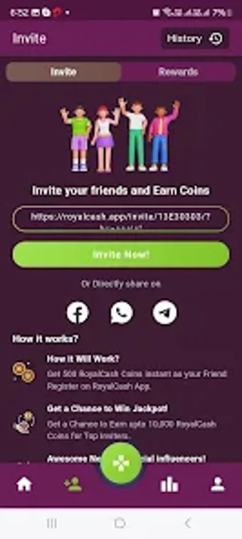 Royalcash - это бесплатное мобильное приложение, доступное на Android, которое предоставляет пользователям платформу для получения вознаграждений за выполнение увлекательных задач. Пользователи могут участвовать в таких мероприятиях, как просмотр видео, заполнение опросов и загрузка приложений, все из которых способствуют накоплению баллов. Приложение предназначено для людей, стремящихся максимально использовать свое свободное время, превращая простые задачи в небольшие доходы.
